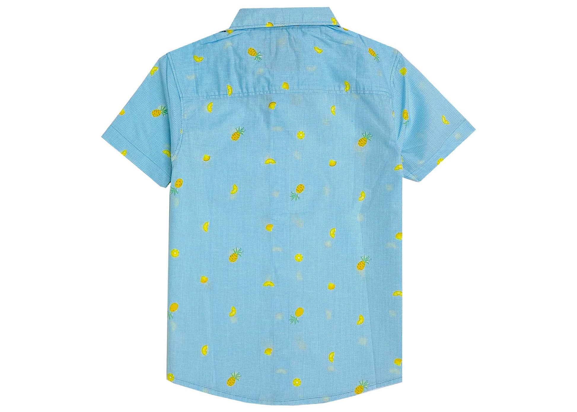 This casual shirt features a spread collar, button placket, short regular sleeves, and a curved hem, all adorned with a pineapple print.